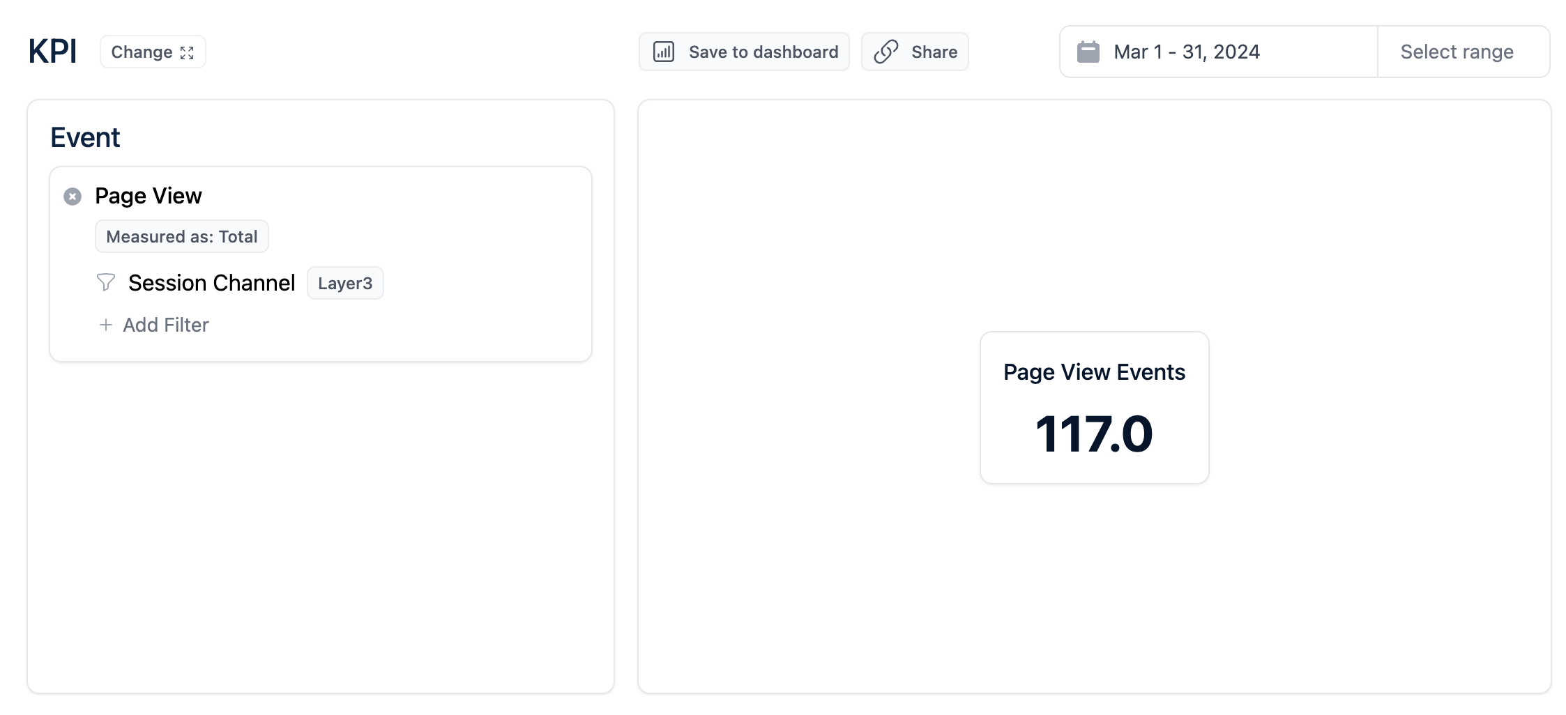 This 'chart type' is really just a headline big number for the top of dashboards. Pick your event, pick your aggregate measure, filter if you want....and then save to the dashboard as your big new KPI.