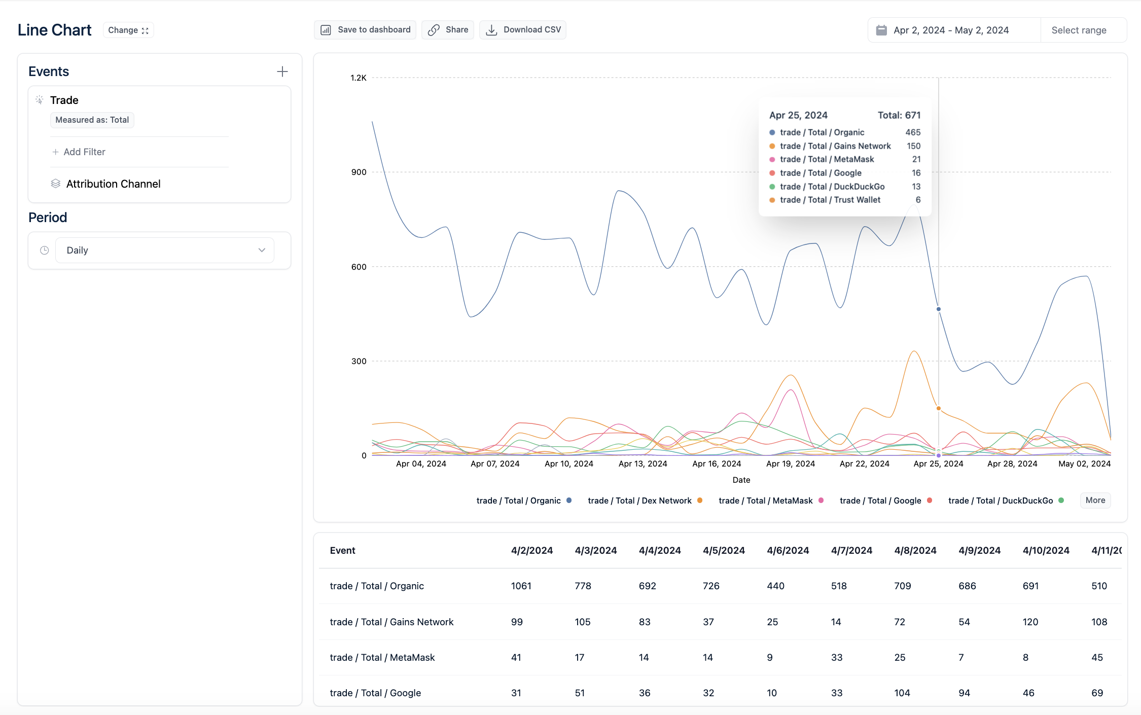 Here are trades pivoted by attributed channel (for how to pivot and segment, see here):\ <br>